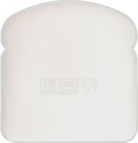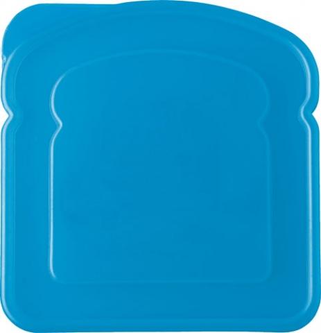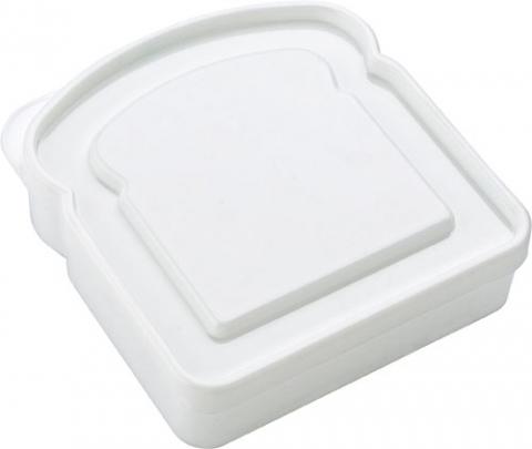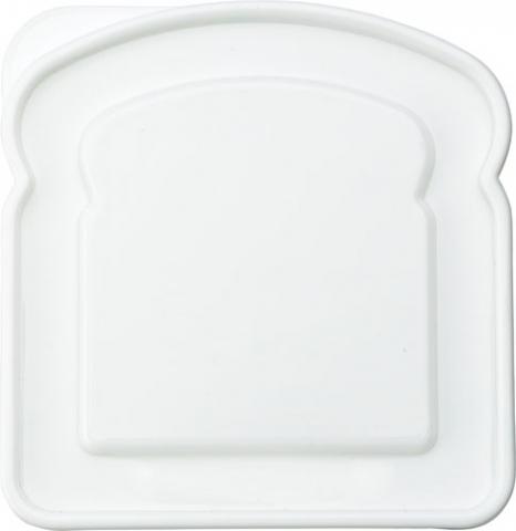 Plastic lunchbox in the shape of a sandwich, at the left upper corner an inlet for easy opening